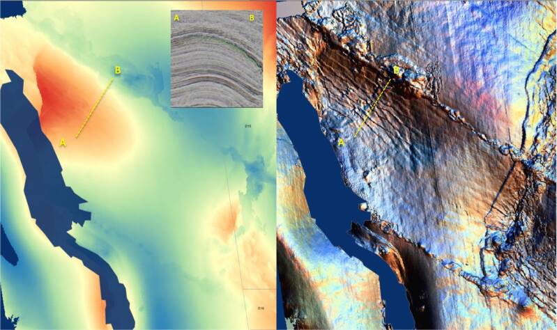 Legacy seismic data can be used to help interpret the complex tectonic history. On the left is the Top Chalk Horizon two-way-time. The expression of a dyke at the paleo-seafloor can be seen as a WNW lineament at 'B'. Its corresponding relief map on the right brings out much more clearly a system of faults hardly visible on the regular map and allows to investigate possible interaction with the underlying salt and fault reactivation.